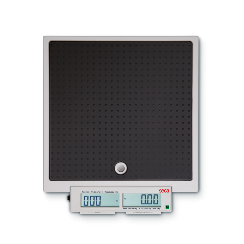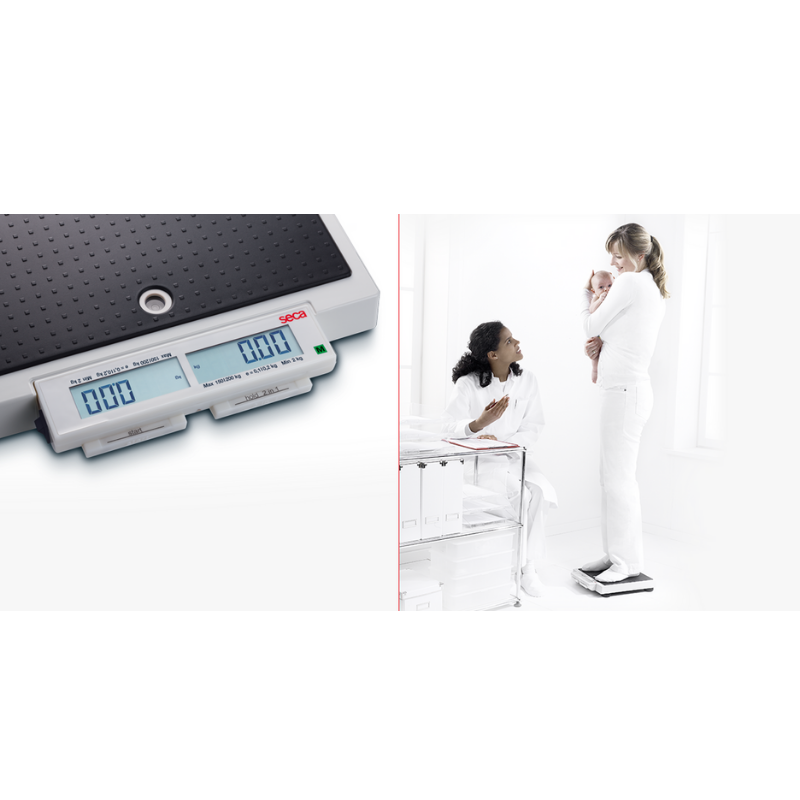 De bajo peso, construcción muy sólida y diseño práctico, con pilas de larga duración y una precisión insensible a niveles de humedad. Cuando se realicen exámenes en serie, no hay necesidad de agacharse una y otra vez; la báscula se enciende y apaga con el simple contacto de la punta del pie sobre un botón. La doble pantalla ofrece una fácil y simultánea lectura para el paciente y el personal médico, desde posiciones opuestas. Y el botón 2 en 1 permite el pesaje de un niño en brazos de sus padres.