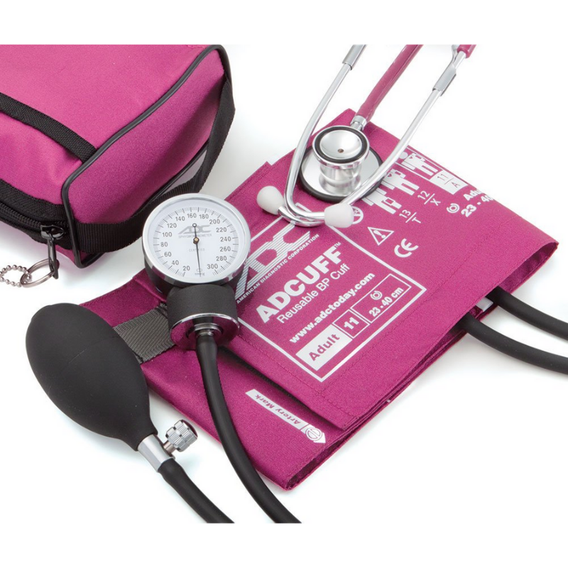 Combo De Estetoscopio y Aparato De Presión En Estuche. Marca: ADC. Un kit profesional que combina nuestro esteroide de bolsillo de la serie 768 más vendido y el estetoscopio de doble cabeza Proscope 670 en un maletín de transporte de gran tamaño.