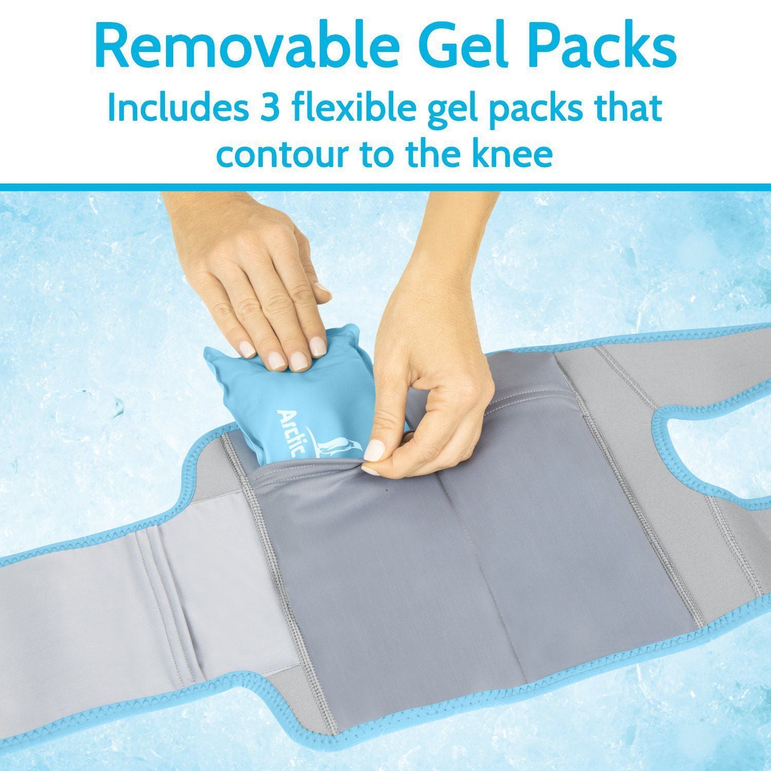 La envoltura de hielo de compresión incluye tres paquetes de gel extraíbles Arctic Flex para proporcionar una terapia relajante con calor o frío. Cada paquete se desliza fácilmente en uno de los tres bolsillos que se alinean en la parte delantera y trasera de la rodilla para aliviar el dolor. Los paquetes de gel Arctic Flex no tóxicos permanecen flexibles cuando se congelan para adaptarse a la rodilla y son reutilizables, a prueba de fugas y sin látex.
