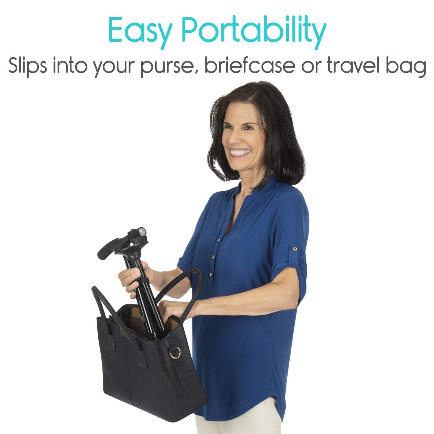 El bastón LED se pliega fácilmente e incluye un cierre de almacenamiento seguro y una bolsa de viaje de nailon.