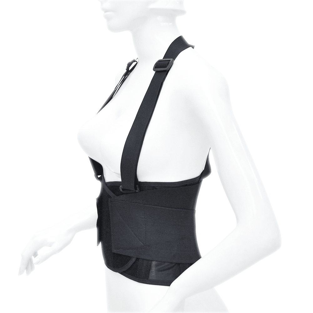 Órtesis con soporte lumbar y cierres elásticos que dan soporte abdominal.